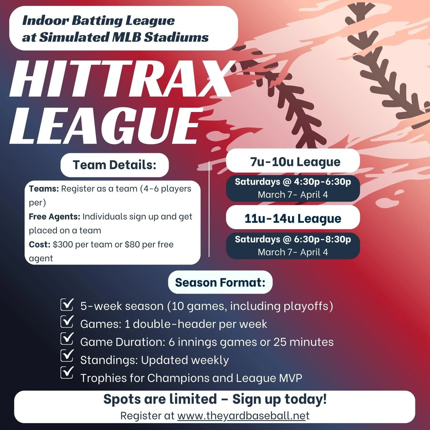 Step into the action and showcase your skills. Contact Info@theyardbaseball.net to sign up!