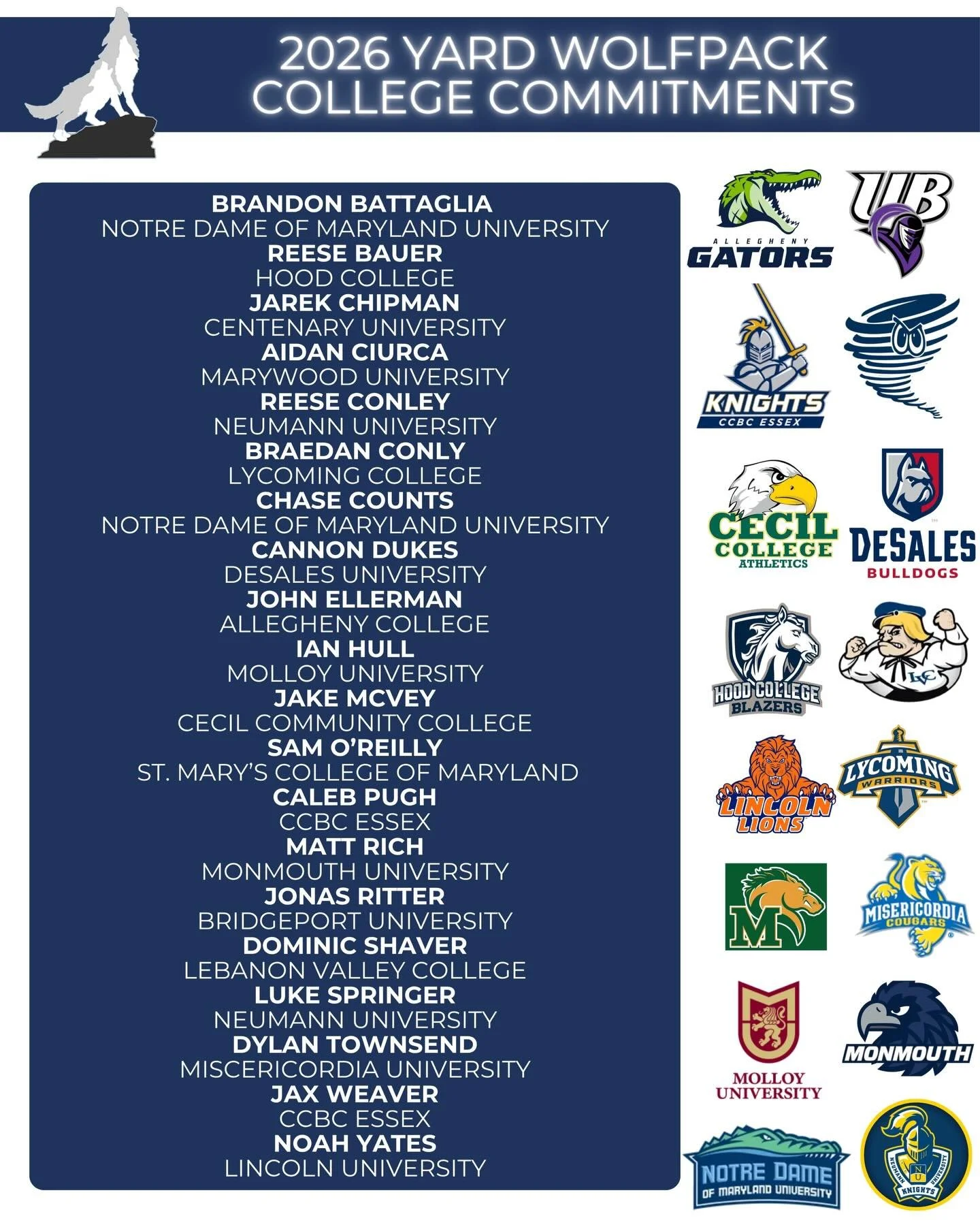 MOUNT ST. MARY'S UNIVERSITY RIDER UNIVERSITY MONMOUTH UNIVERSITY FROSTBURG STATE UNIVERSITY MOLLOY UNIVERSITY GOLDEY-BEACOM COLLEGE UNIVERSITY OF BRIDGEPORT ALLEGHENY COLLEGE STEVENSON UNIVERSITY MISERICORDIA UNIVERSITY DESALES UNIVERSITY HARFORD COMMUNITY COLLEGE